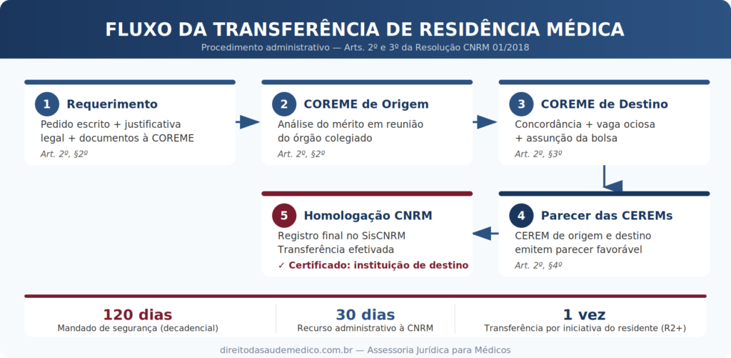 O médico residente protocola o pedido por escrito à COREME do programa de origem. O requerimento deve conter: identificação completa do requerente, hipótese legal invocada, documentação probatória completa, identificação do programa de destino e comprovação da vaga ociosa disponível. A COREME de origem tem 30 dias para se manifestar, nos termos do art. 6º da Lei nº 9.784/1999.